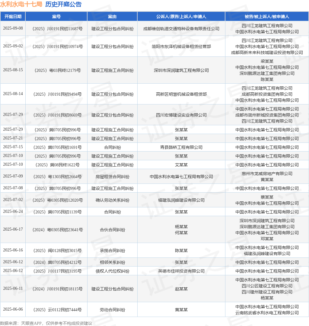 本站消息,根据天眼查APP显示,近日公布了一则中国水利水电第七工程局有限公司作为被告/被上诉人的开庭公告,详细内容如下: